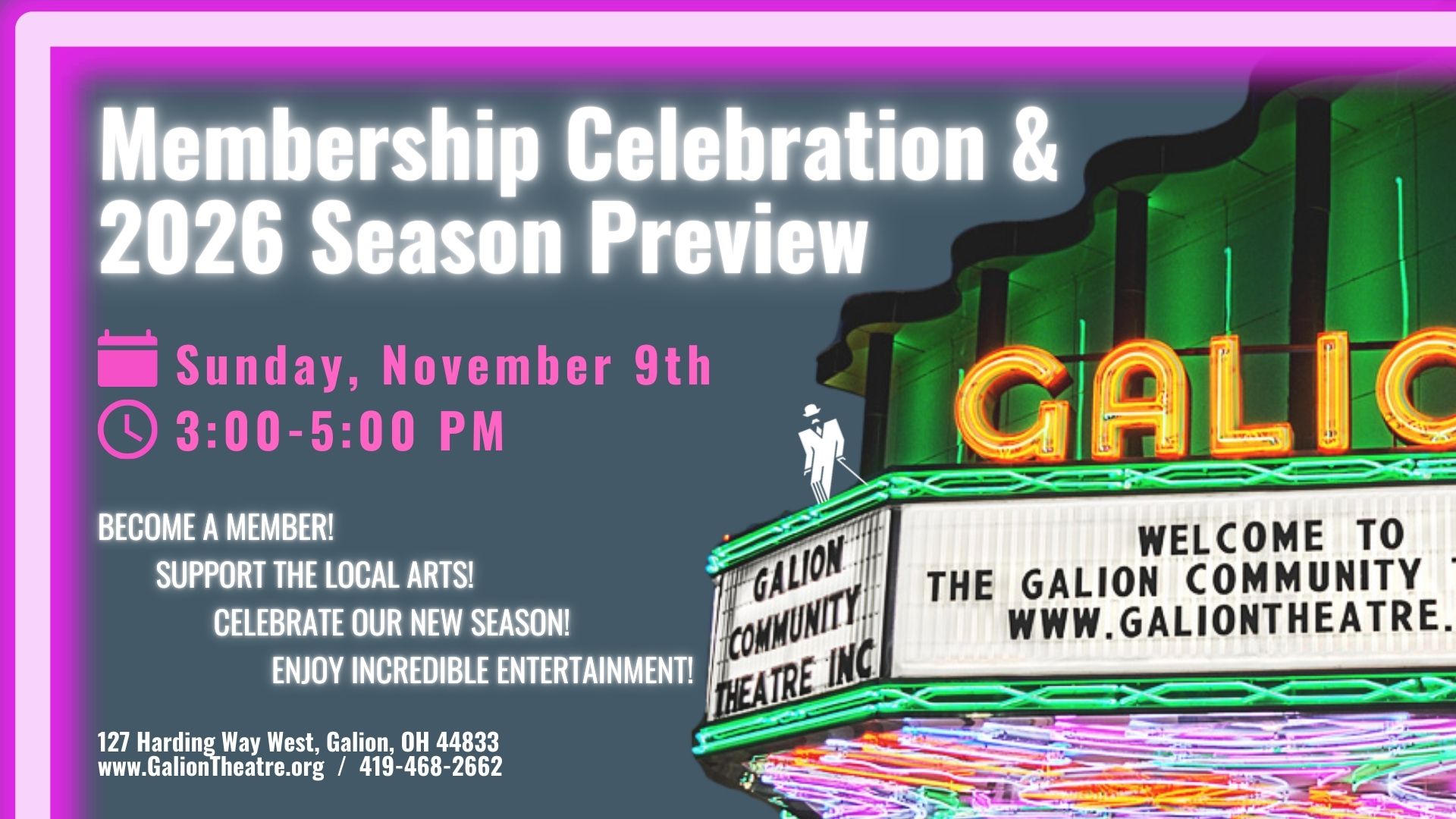 Help us celebrate Galion Community Theatre's next season! 2026 is going to be an incredible lineup of shows, and we want YOU to join in the entertainment. Join us on Sunday, November 9th at The Galion to renew your membership, become a new member, or just learn about what we have going on.